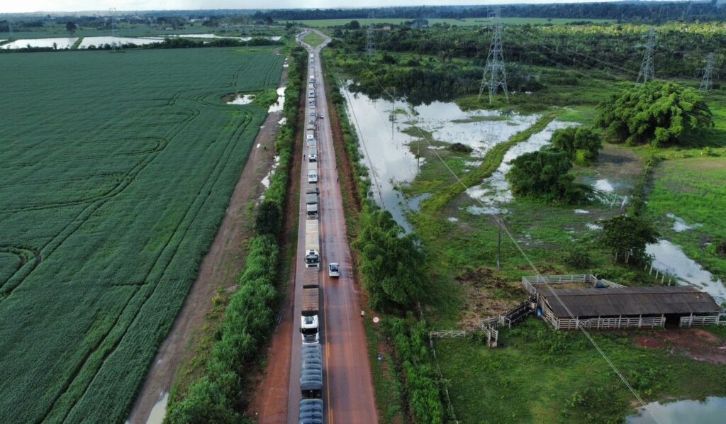 O tráfego na BR-364 está parcialmente bloqueado nesta quinta-feira (29), no km 563, nas proximidades do município de Cujubim, em Rondônia. Produtores rurais realizam um protesto contra a cobrança de pedágio e pedem a revogação do plano de desocupação da Estação Ecológica Soldado da Borracha.